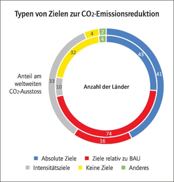 Doch nicht nur die Klimapolitik fällt jeweils unterschiedlich aus. Die Klimaziele, welche die Länder nach dem Übereinkommen von Paris veröffentlicht haben, sind ebenfalls differenziert. Eine vom deutschen Umweltbundesamt im Jahr 2016 veröffentlichte Studie (vgl. Abbildung «Typen von Zielen zur CO2-Emissionsreduktion») bringt es auf den Punkt. Einige Länder geben sich absolute CO2-Reduktionsziele, andere geben Reduktionsziele im Verhältnis zu einer hypothetischen Zukunft – Annahme: Business as usual (BAU) – an, andere wiederum fokussieren auf die CO2-Intensität. 32 Länder geben überhaupt keine Ziele an.