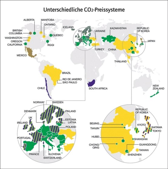 Die Welt kennt unterschiedliche Formen der Klimapolitik, die auf Preise für den CO2-Ausstoss aufbauen (vgl. Abbildung «Unterschiedliche CO2-Preissysteme» mit der Landkarte; Quelle: Weltbank 2015). Dabei verfügen die grün markierten Länder über ein Emissionshandelssystem. Die blau markierten arbeiten stattdessen mit einer CO2-Steuer. Blau-grüngestreift markierte Länder, so auch die Schweiz, kennen beides als Alternativlösungen für die Wirtschaft. Gelb markierte Länder erwägen, ein Emissionshandelssystem (die Mehrheit der Länder) oder eine Steuer (die Minderheit) einzuführen.