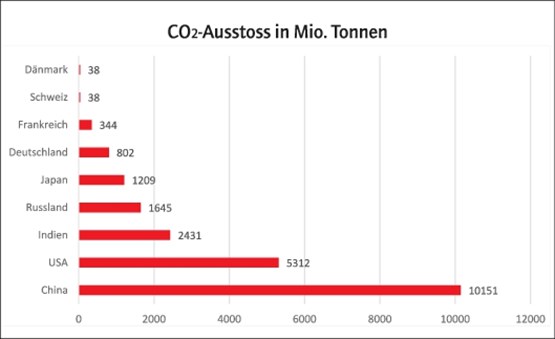Die grössten Emittenten in absoluten Zahlen sind China, die USA, Indien, Russland und Japan (vgl. Abbildung «CO2-Ausstoss in Mio. Tonnen»; Quelle: Global Carbon Project 2016). Auf die Schweiz gehen etwa 0,1 Prozent aller weltweiten Emissionen zurück. Mit 8 Millionen Einwohnern emittiert die Schweiz etwa gleich viel wie Dänemark mit etwa 5,5 Millionen Einwohnern.