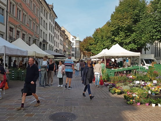 Retour en ville où le marché (photo) a installé ses tréteaux regorgeants de produits frais. Le boucher appâte le chaland avec ses saucisses qui embaument. Petit-déjeuner comme les Schaffhousoises savent le préparer avec force charcuterie et petites merveilles. Et puis, c’est reparti pour un tour en ville!